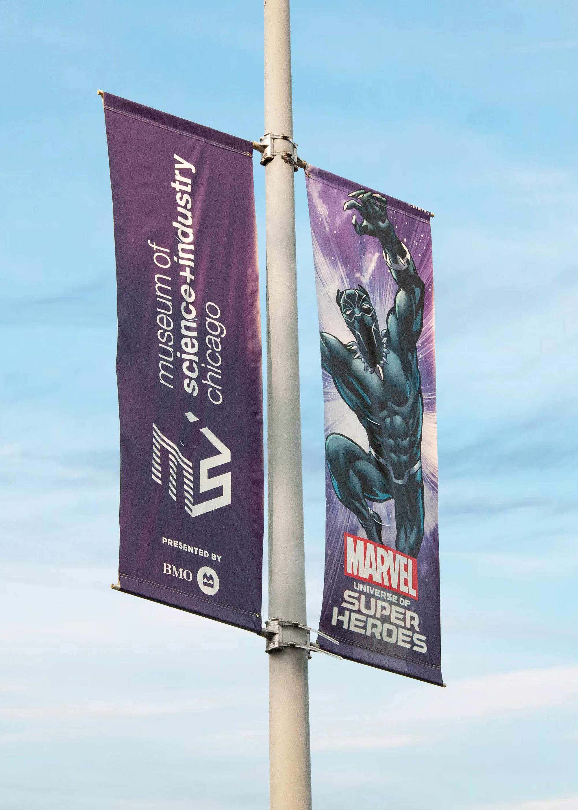 Marvel Banners on the Museum of Science and Industry’s North Portico